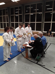 Zum Jahresende wurde nach intensiver Vorbereitung eine Prüfung im JuJutsu beim Judo Club Osterode abgelegt. Unter der fachkundigen Aufsicht durch die Prüfer Horst Dieter Häusler ( 3.Dan JuJutsu und 2.Dan Judo) sowie Manfred Kast ( 1.Dan JuJutsu und 2.Dan Judo) stellen sich 5 Prüflinge den anspruchsvollen Aufgaben zum 4.Kyu ( Orangegurt).